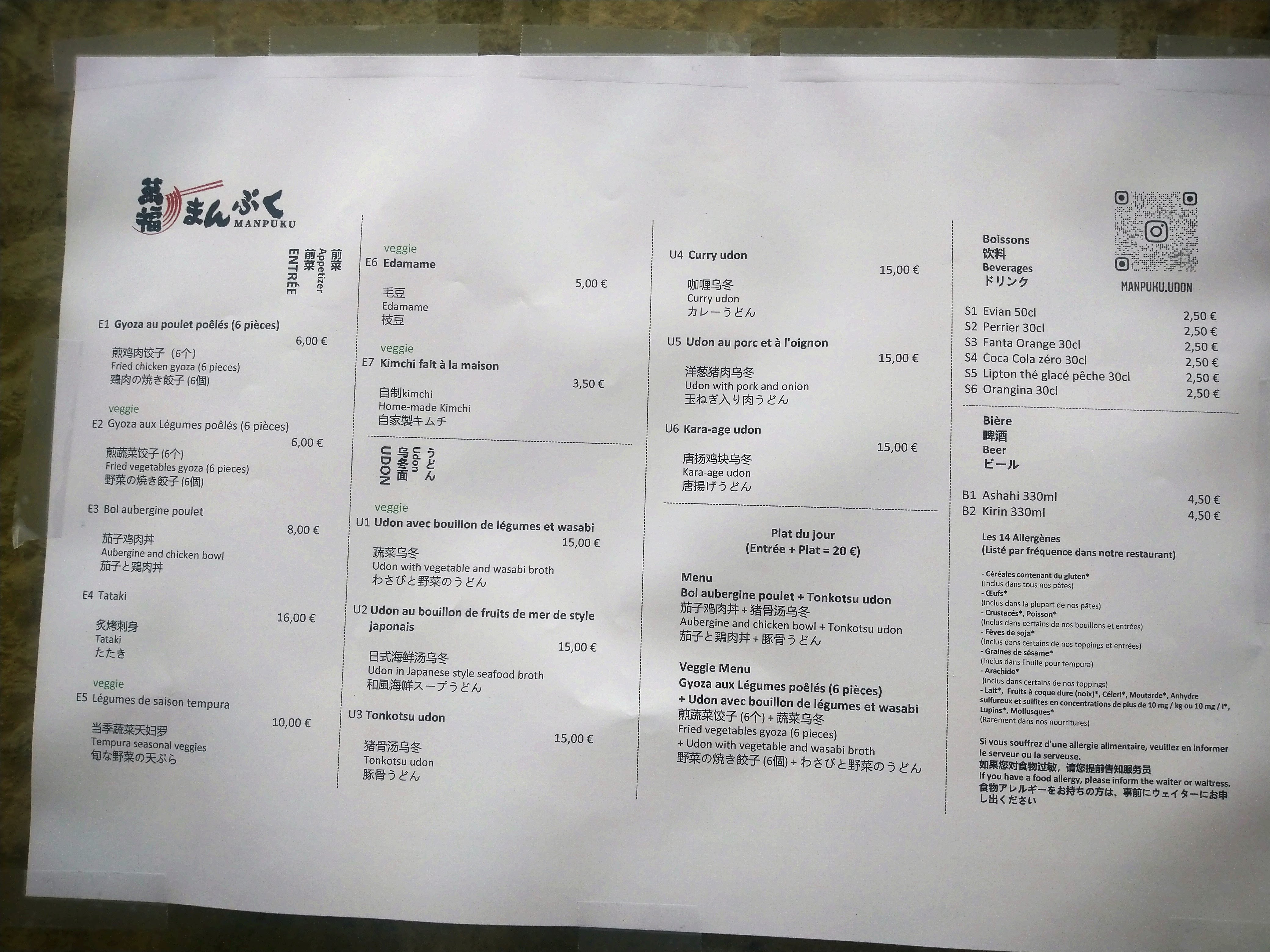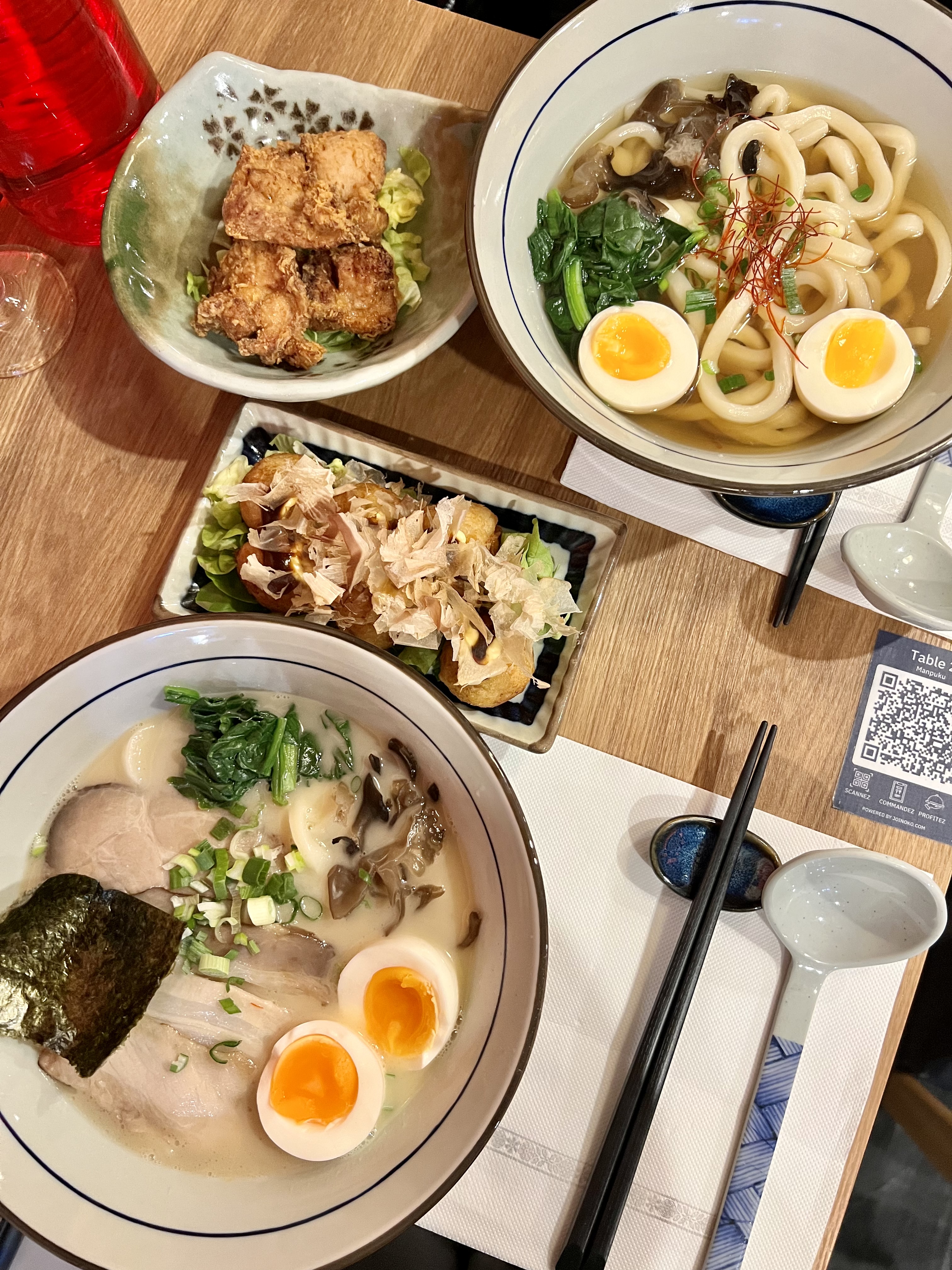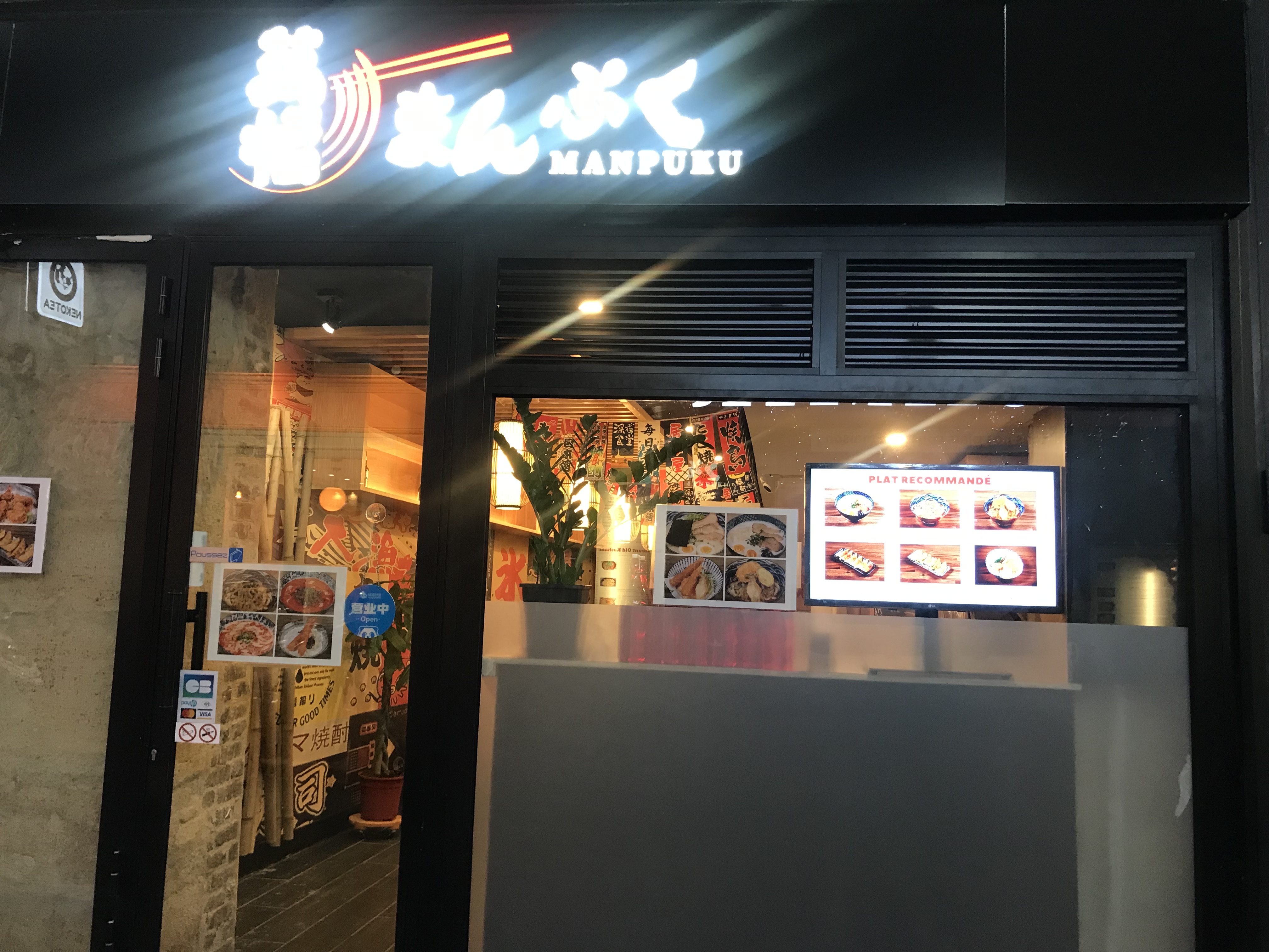🎴L'emplacement à Odéon, la décoration japonaise, l'accueil chaleureux de Norris, et qualité et la variété des plats font un excellent restaurant ! Les entrées sont délicieuses ! J'ai testé les takoyakis, les umaki et le tataki au thon (je vous recommande ce tataki 🐟!). Ce qui démarque Manpuku des autres, ce sont les nouilles udon faites maison 🍜 (élastique et tendre 😋). Les udons arrivent bien chauds à table (le bol est chauffé avant), le bouillon est bien assaisonné. Pour ceux qui ne mangent pas de porc, ils proposent un alternative: le bouillon aux fruits de mer 🦞. Et si vous n'arrivez pas à finir vos assiettes, commandez du saké🍶🤭 🥬: option végétarienne possible
