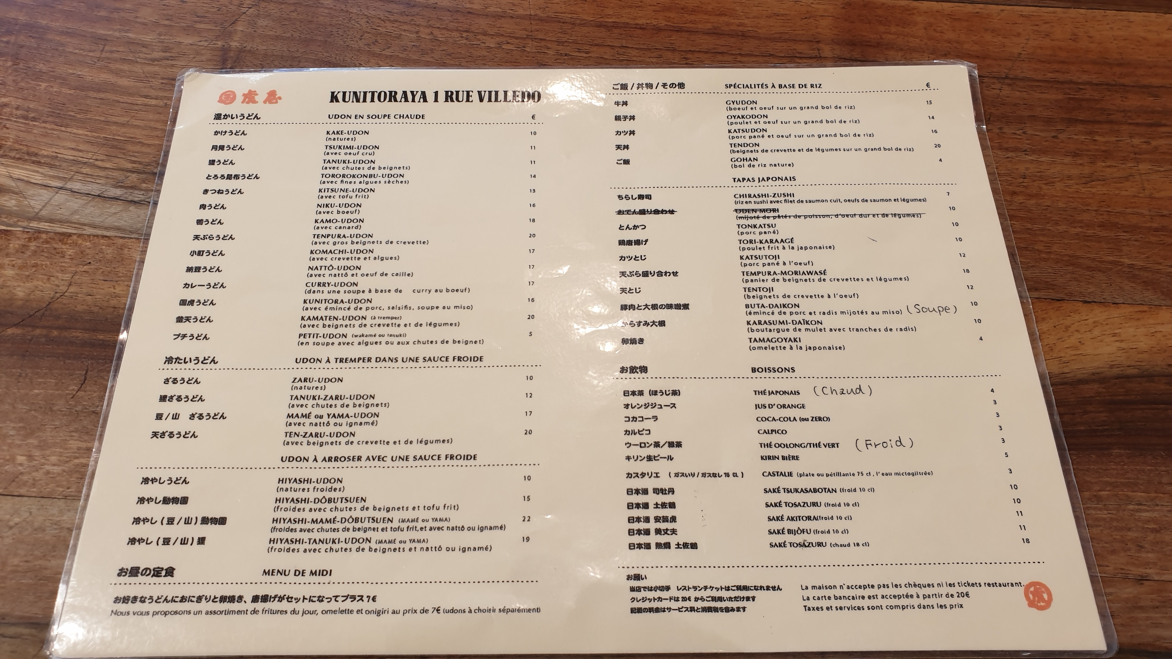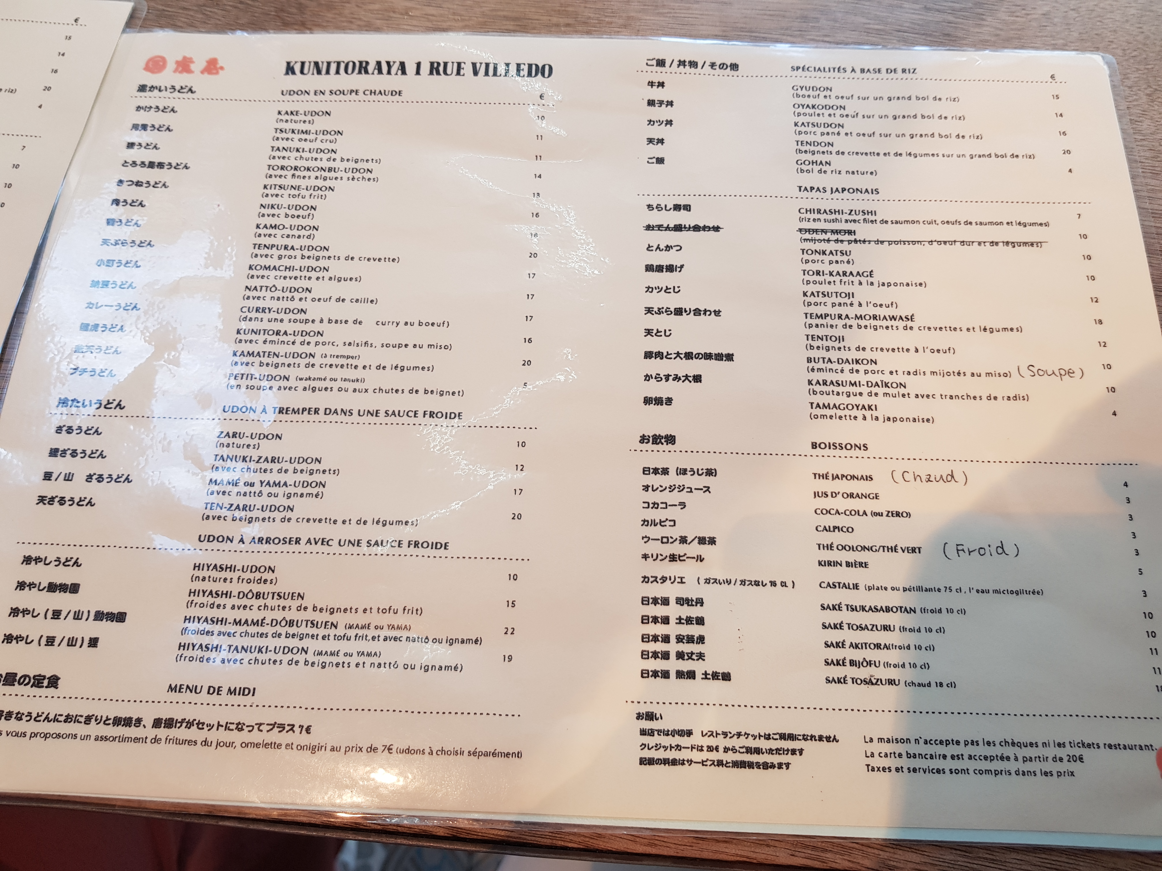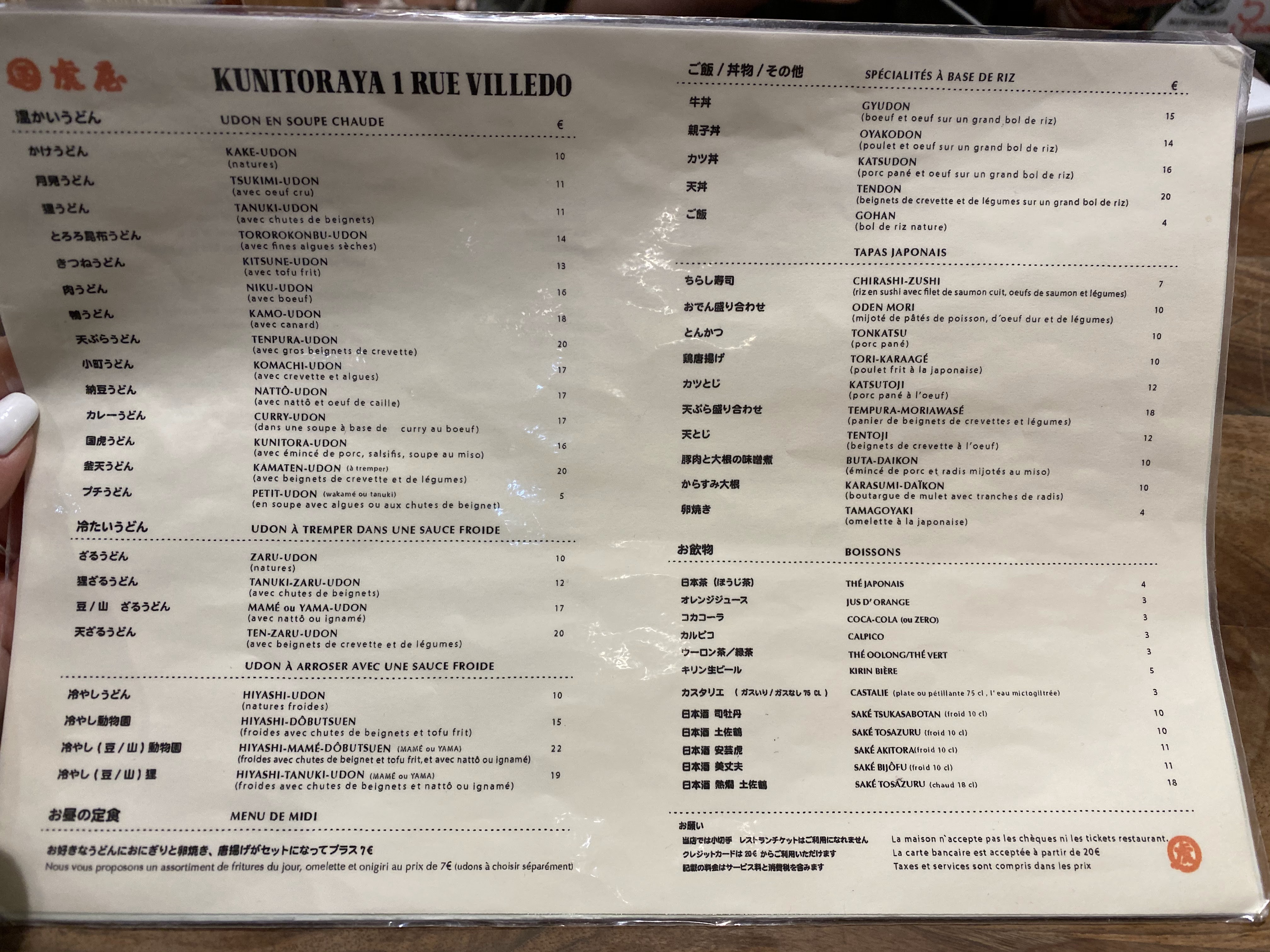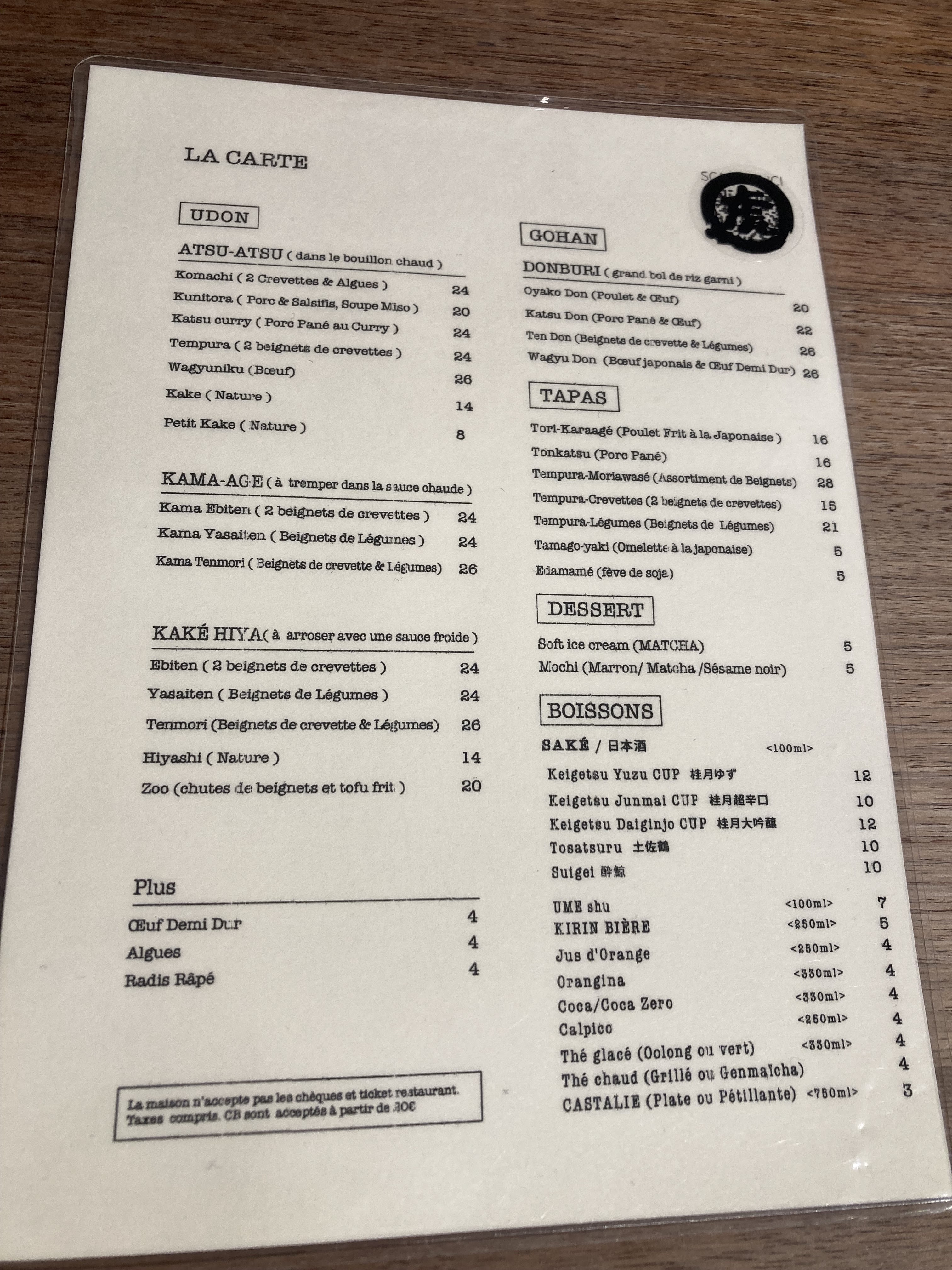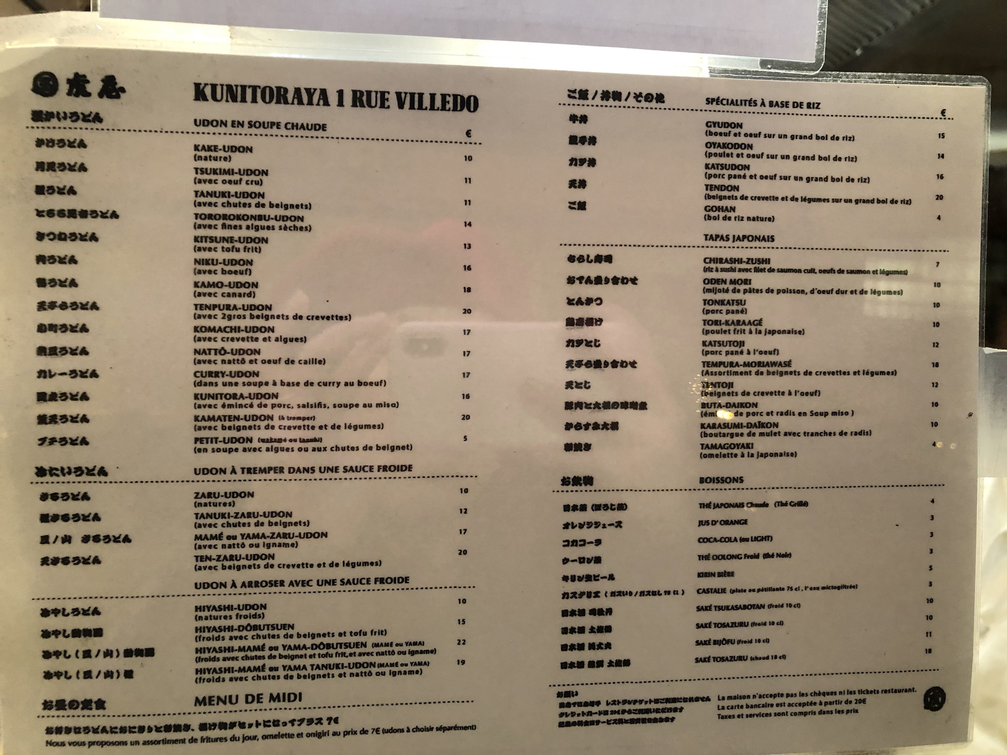 Les Udon sont délicieux cependant le service n’est pas du tout à niveau. Déjà dans la file d’attente a l’extérieur du restaurant avant l’ouverture du soir, la fille ne salue même pas les clients direct « two people? ». Nous avons attendu 30mins avant d’être servis, on a posé la question à la serveuse, elle ne comprends pas très bien le français ni l’anglais. En plus, les touristes à côté de nous à trouvé des cheveux dans leur bol de riz. Dépenses moyen: 20€ +. Concernant les modes de paiement, CB à partir de 20€. Amex JCB non accepté ni ticket restaurant ni carte restaurant. Pour le udon à Paris, je vais rester sur Sanukiya.