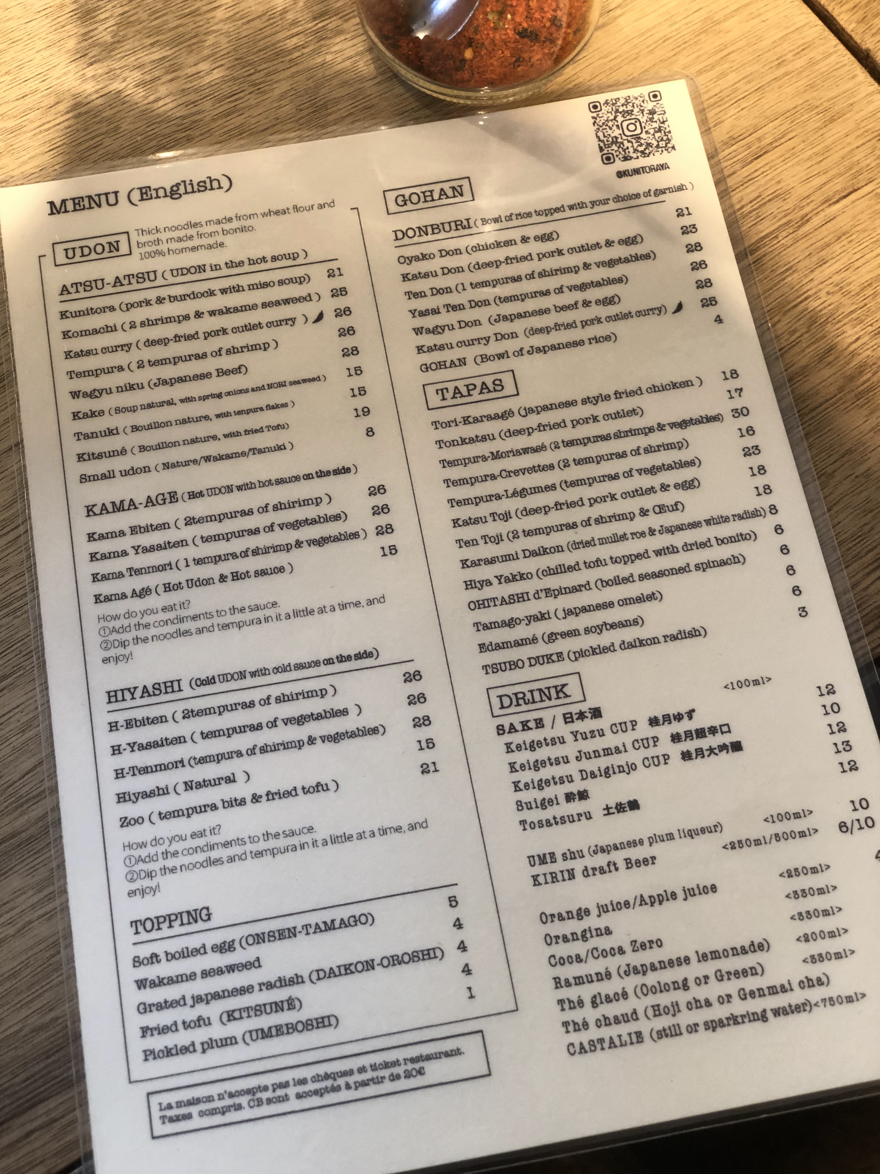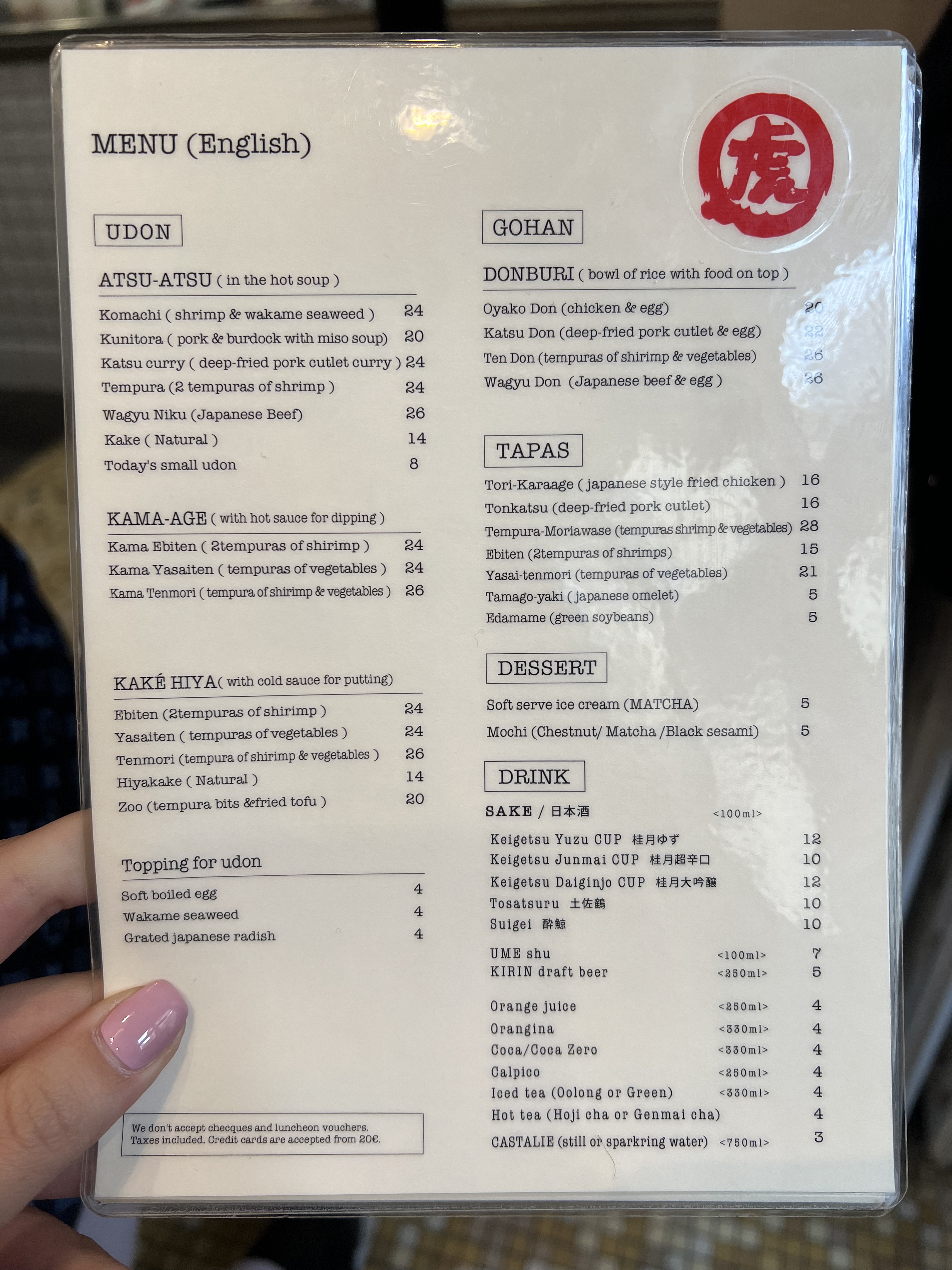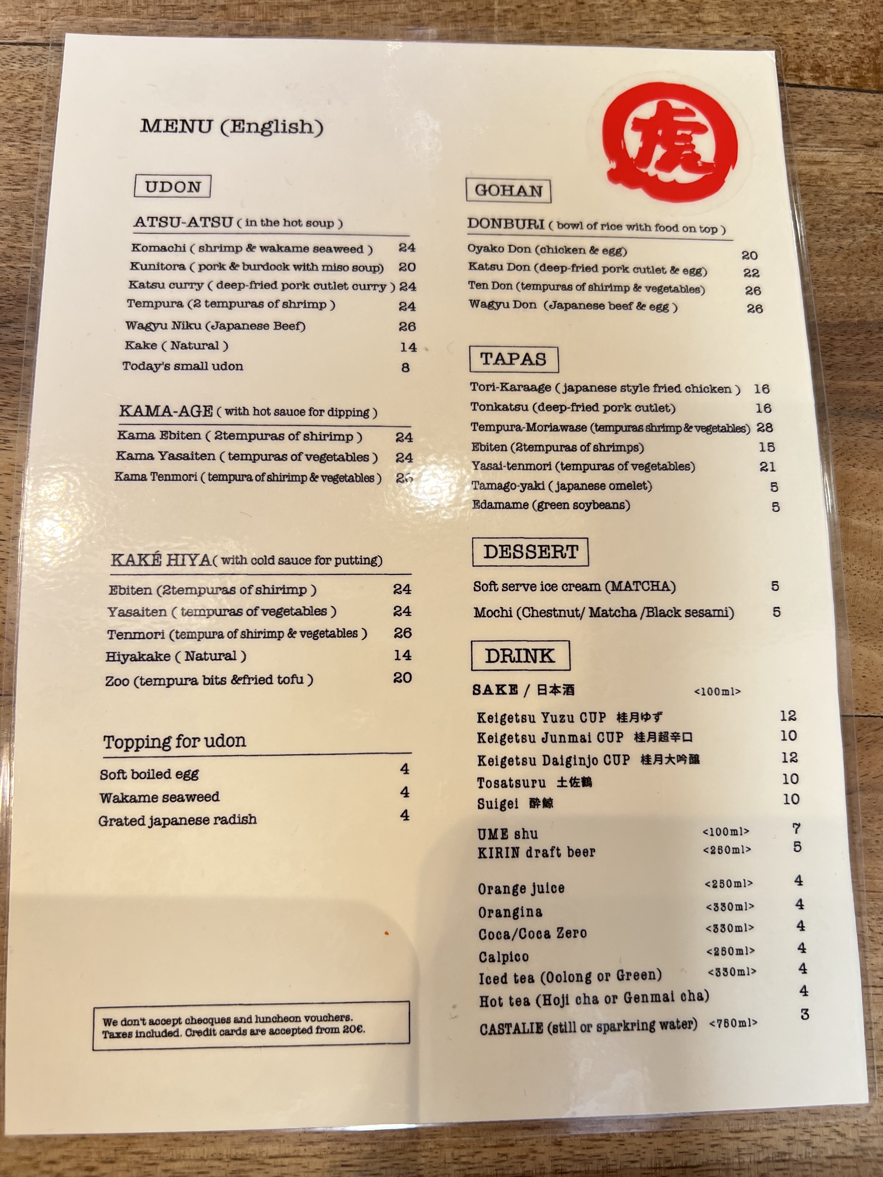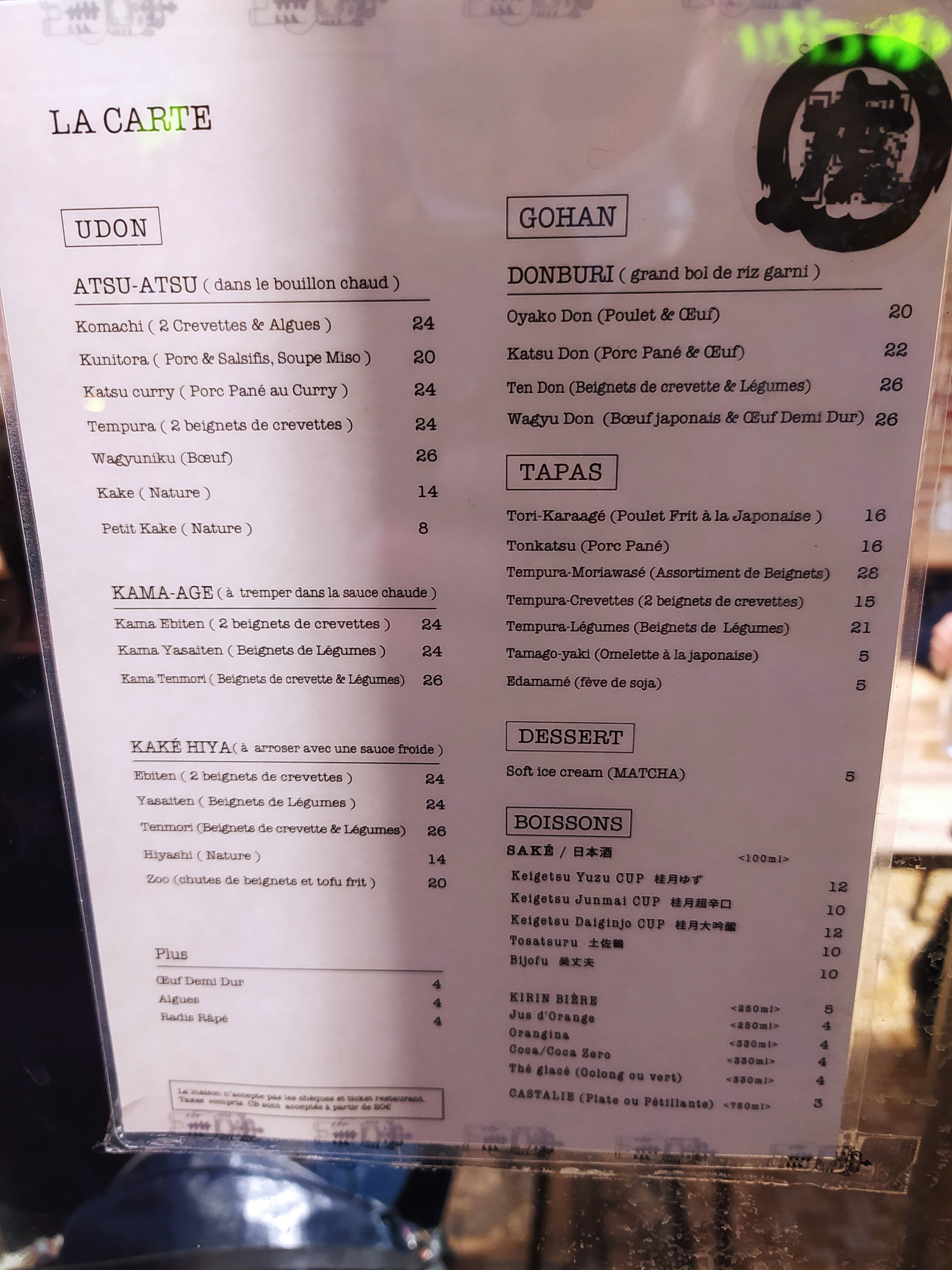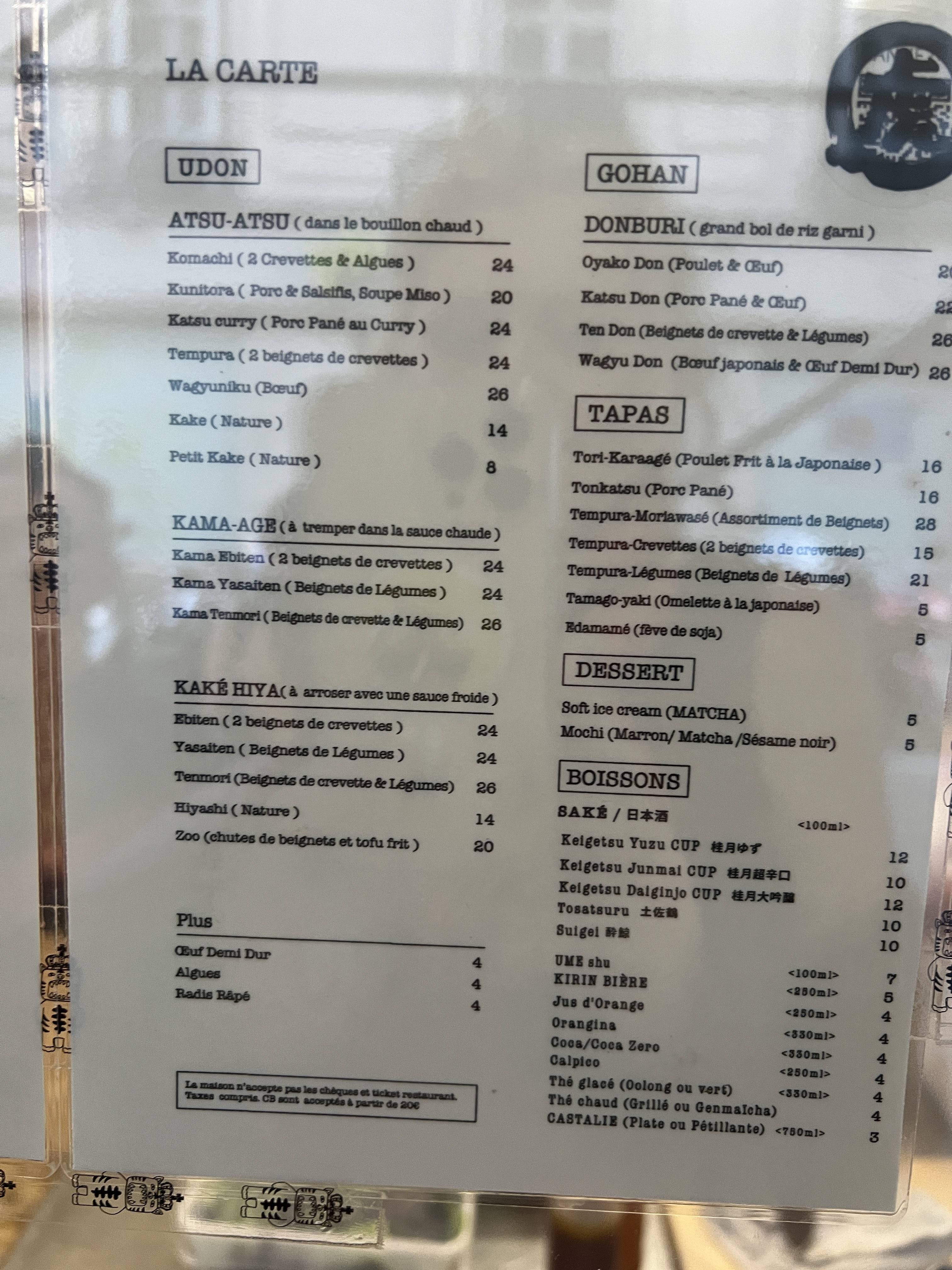 Les Udon sont délicieux cependant le service n’est pas du tout à niveau. Déjà dans la file d’attente a l’extérieur du restaurant avant l’ouverture du soir, la fille ne salue même pas les clients direct « two people? ». Nous avons attendu 30mins avant d’être servis, on a posé la question à la serveuse, elle ne comprends pas très bien le français ni l’anglais. En plus, les touristes à côté de nous à trouvé des cheveux dans leur bol de riz. Dépenses moyen: 20€ +. Concernant les modes de paiement, CB à partir de 20€. Amex JCB non accepté ni ticket restaurant ni carte restaurant. Pour le udon à Paris, je vais rester sur Sanukiya.