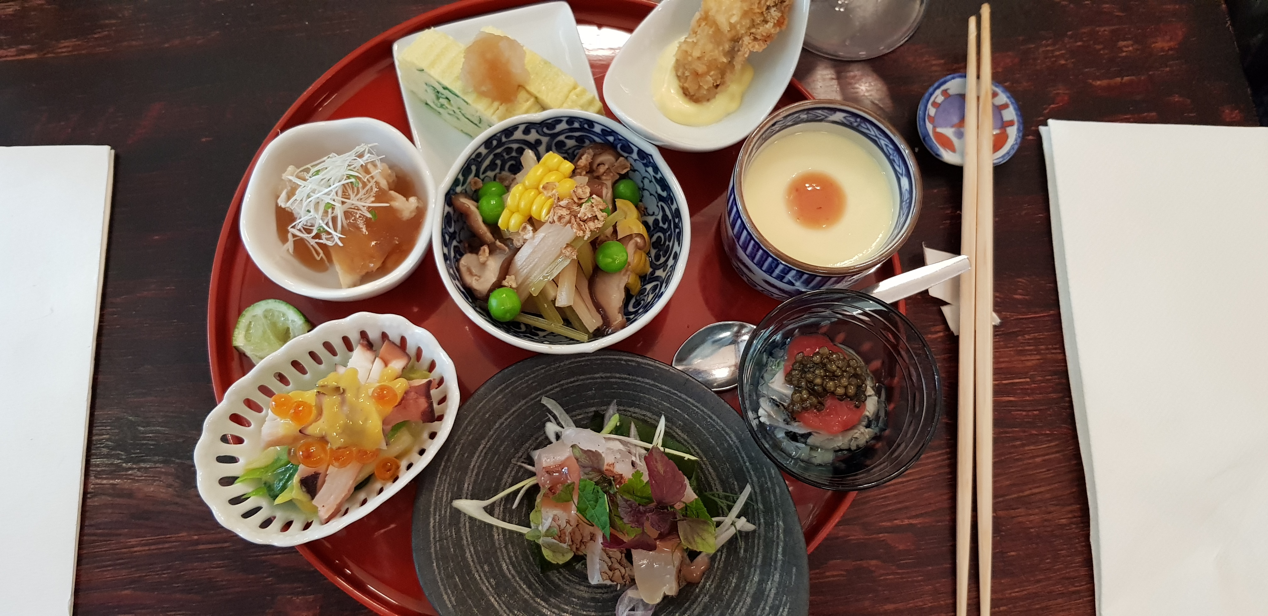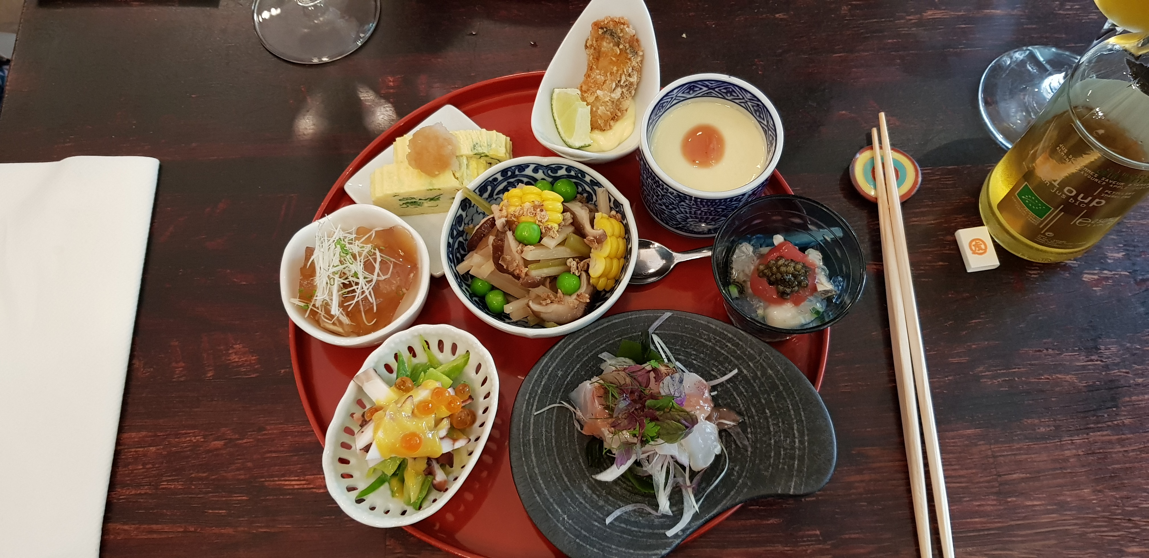Excellent service à la fois sympathique et professionnel à la hauteur des propositions du chefs. Nous avions pris le menu dégustation (coup de coeur pour les huîtres et la bonite). Nous avons été très bien conseillés pour le saké. Les bouillons de la marque vendus dans le restaurant et également disponibles chez kioko sont excellents.
