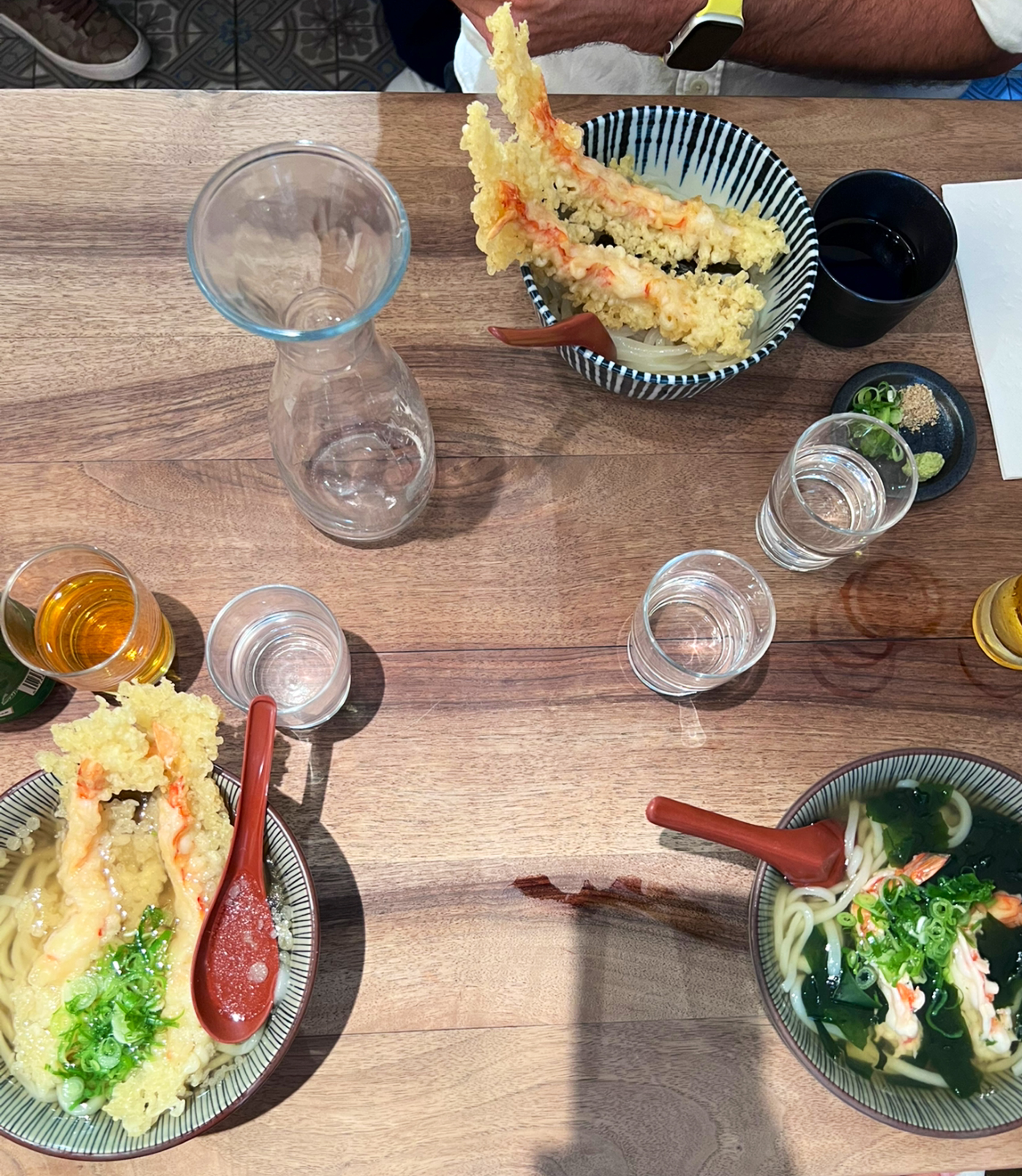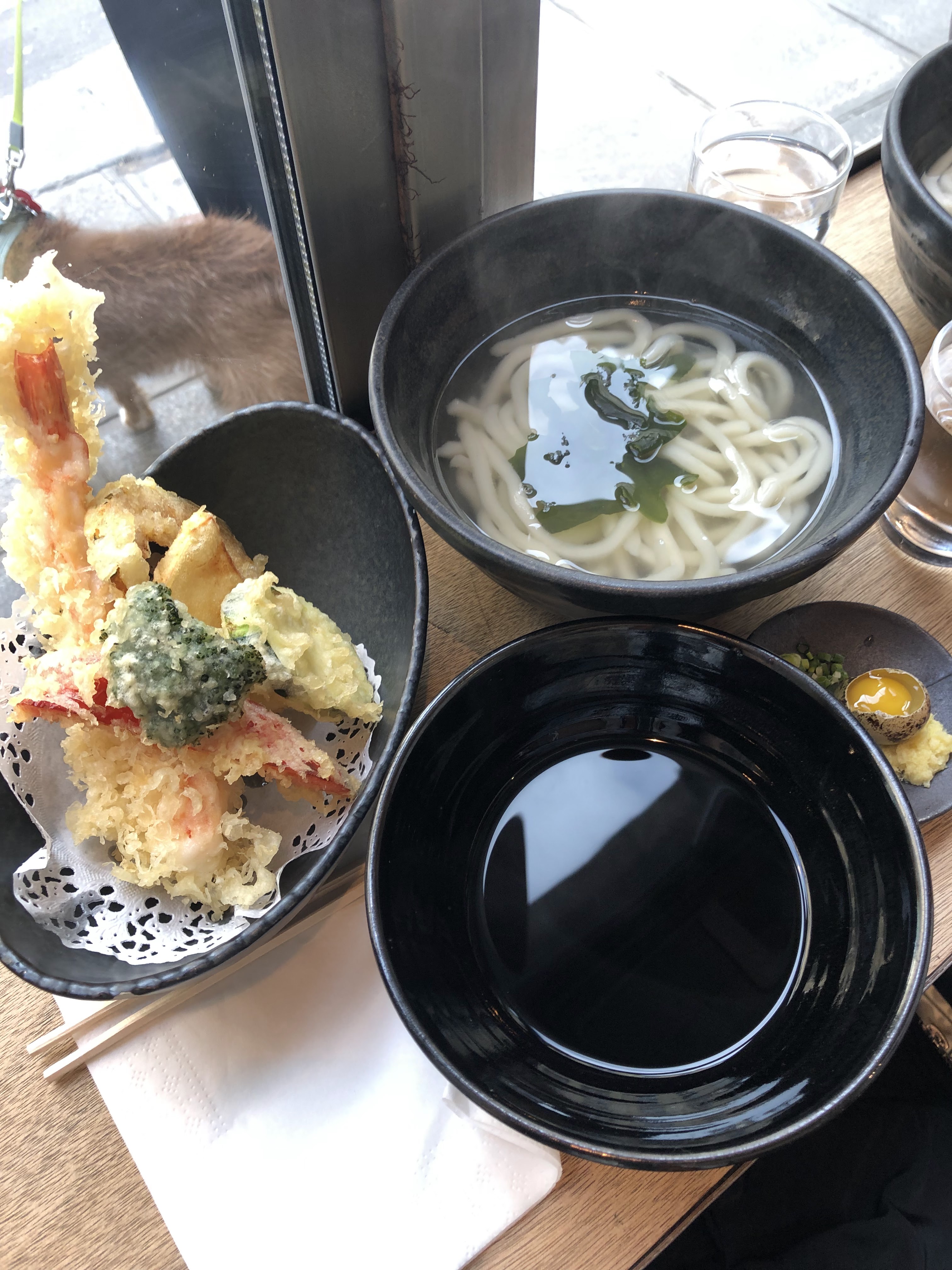 Udon goutu, mochi marron mmmmmmmm. Et les tempuraaaaaaa ahaha hahaha. Les verres sont posés frais, le détail qui tue. Ça c'est du chef !👏
